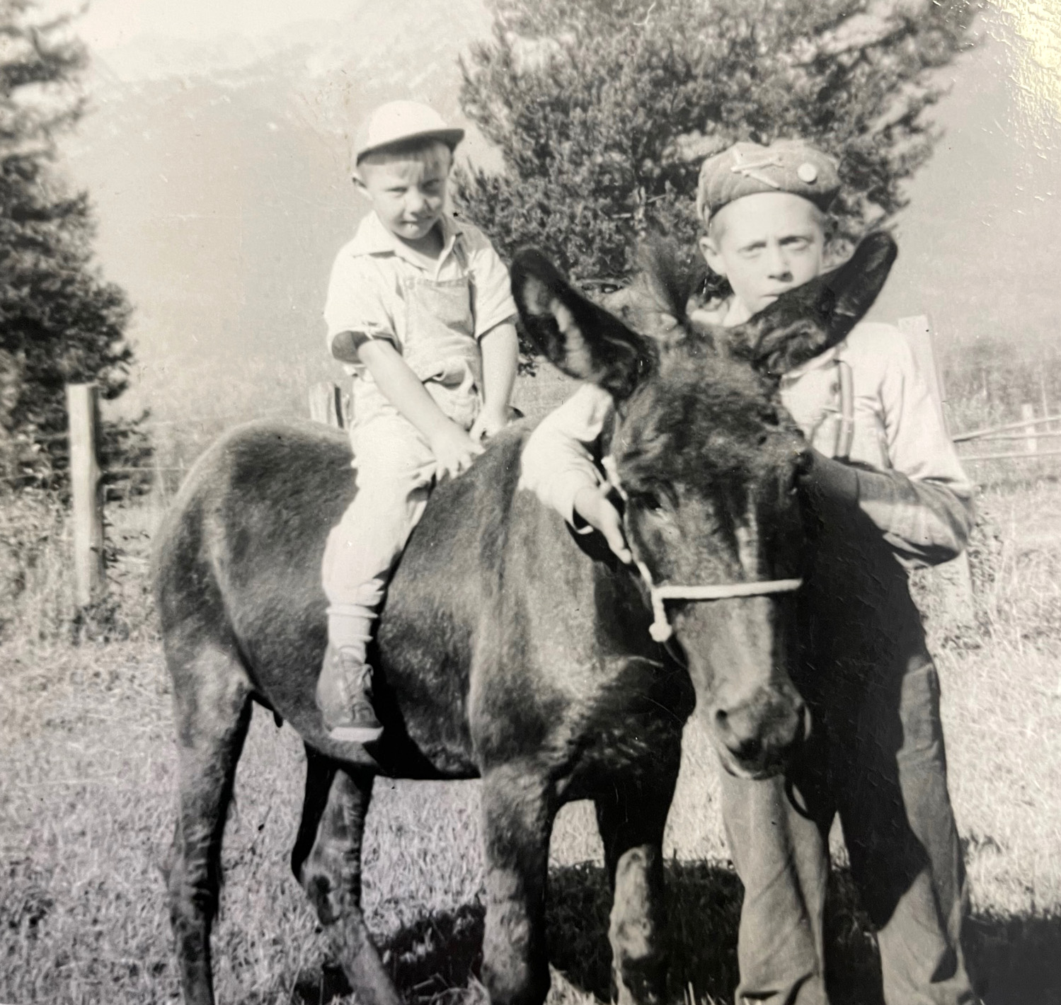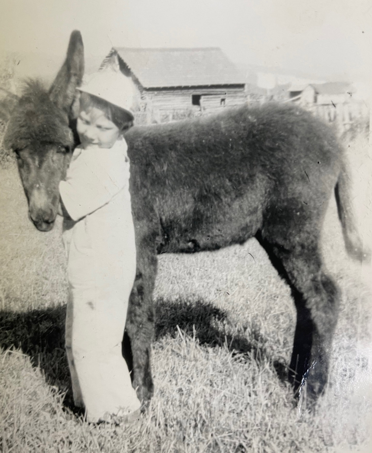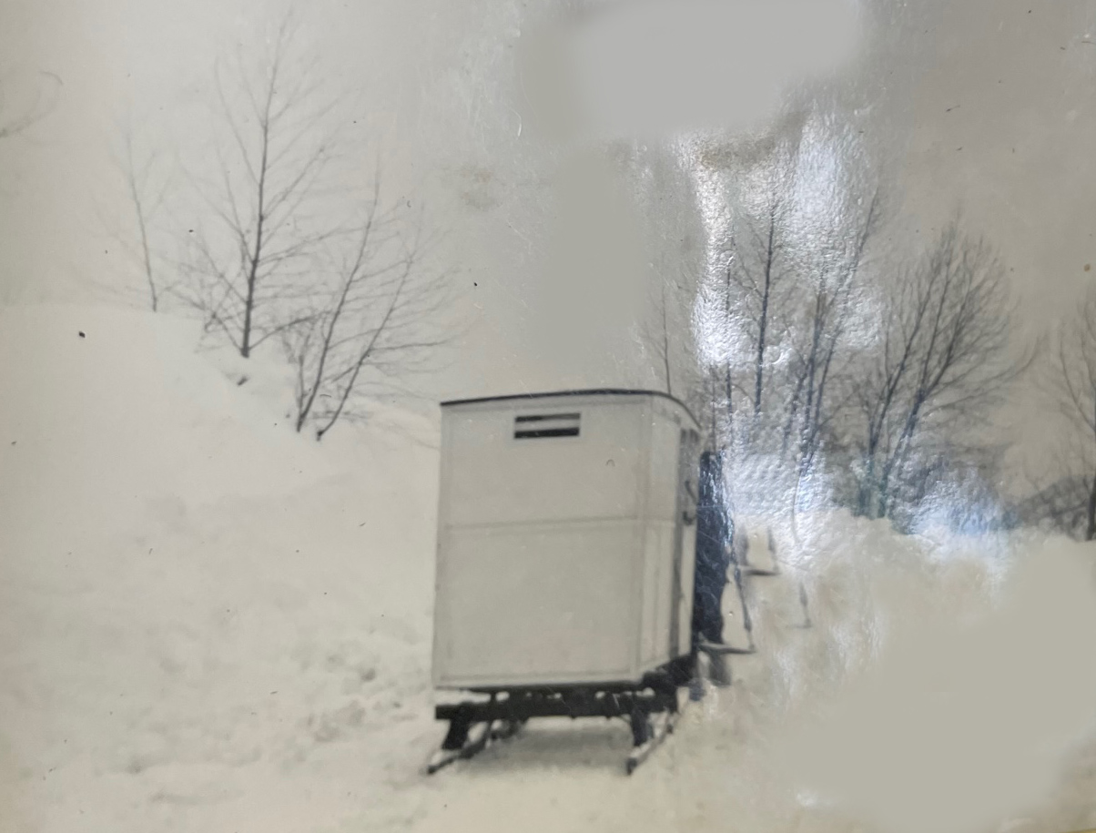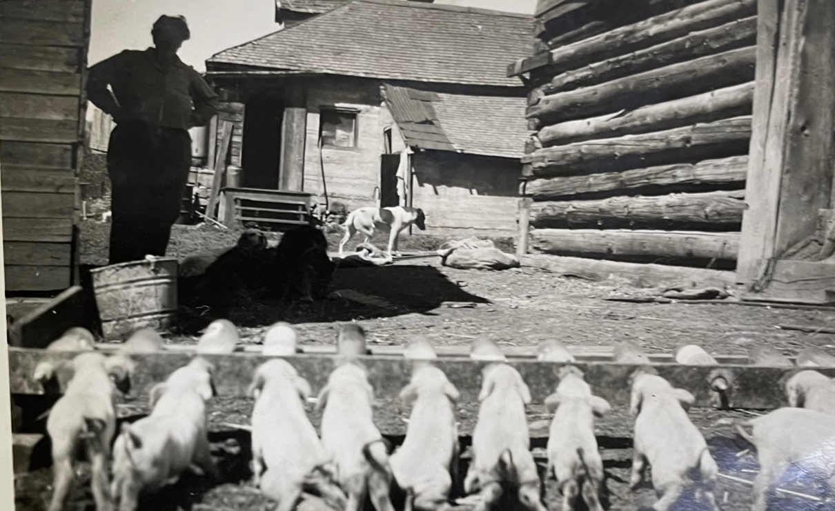 Ed stops for a moment to speak about a skating rink situated at one time at bottom of road down past the Leroux Mansion. A photo of the bridge at Cokato with a sleigh taking milk to town, another of Elsie Anderson and Shirley Vandenburg, and a delightful image of a row of piglets sucking on bottles. Ivy Harrad had devised this apparatus to help the piglets feed. Another interesting photo shows Ed with a donkey, behind Granny Vandenberg’s house.