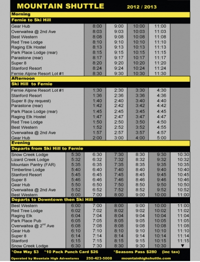 The route has been adjusted from last year. Evening shuttles will now begin at locations along Highway 3, then stop downtown before departing to the ski hill.