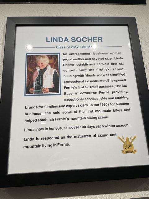 Firstly Linda Socher, entrepreneur, businesswoman, proud mother, and devoted skier. She established Fernie’s first ski school, built the first ski school building with friends and was a certified professional ski instructor, she opened the first ski retail business in downtown Fernie, providing exceptional services, skis, and clothing brands for families and expert skiers, In the 1980’s for summer she sold some of the first mountain bikes and helped establish Fernie’s mountain bike scene, she still skis over 100 days each winter, she is respected as the matriarch of skiing and mountain living in Fernie.