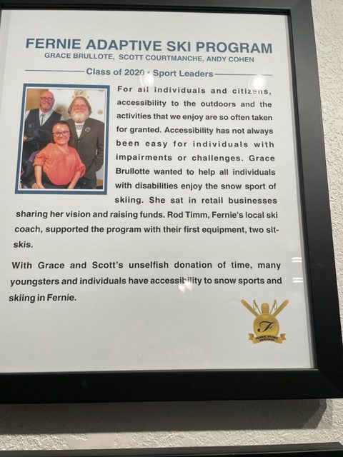 Karen then introduced the Sport Leader Category: Fernie Adaptive Ski Program, an inclusive organization helping all individuals to get access to snow sports and skiing. “Grace Brulotte, Scott Courtmanche and Andy Cohen made sure that all had accessibility to the outdoors and the activities that most take for granted. Accessibility hasn’t always been easy for individuals with impairments or challenges. Grace Brulotte wanted to help all individuals with disabilities enjoy the snow sport of skiing, she sat in retail businesses sharing vision and raising funds. Rod Timm, Fernie’s local ski coach supported the program with their first equipment of two sit skis. With Grace and Scott’s unselfish donation of time, many youngsters and individuals have accessibility to snow sports and skiing in Fernie”.