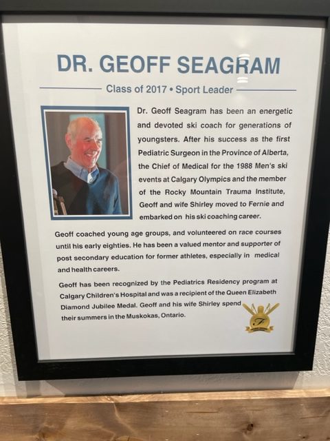 Lenka introduced 2017 inductee Dr. Geoff Seagram who has been an dynamic and dedicated ski coach for many youngsters. After his success as the first Pediatric Surgeon in Alberta and Chief of the 1988 men’s ski events at Calgary Olympics and member of the Rocky Mountain Trauma Institute Geoff and wife Shirley moved to Fernie and embarked on his ski coaching career. Geoff coached young age groups and volunteered on race courses, he has been a valued mentor and supporter of post secondary education for former athletes especially in medical and health careers. Geoff has been recognised by the Pediatrics Residency program at Calgary Children’s Hospital and was recipient of the Queen Elizabeth Diamond Jubilee Medal.