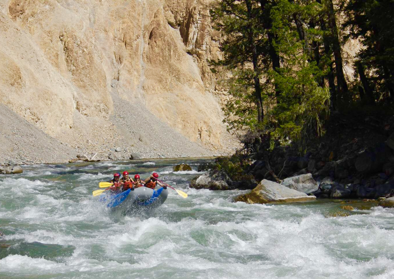Mountain High Adventures is thrilled to offer the first Mammoth Rafts in Canada. These light-weight, high performance six-seater rafts have an instant draining mesh floor and wave punching catamaran tubes that send the raft rocketing high over waves. It resurfaces quickly after charging through a hole. Even the smallest rapid feels sporty in the Mammoth!