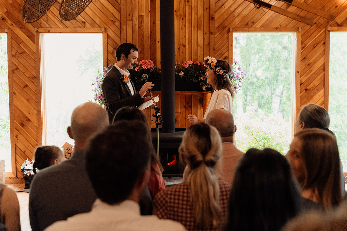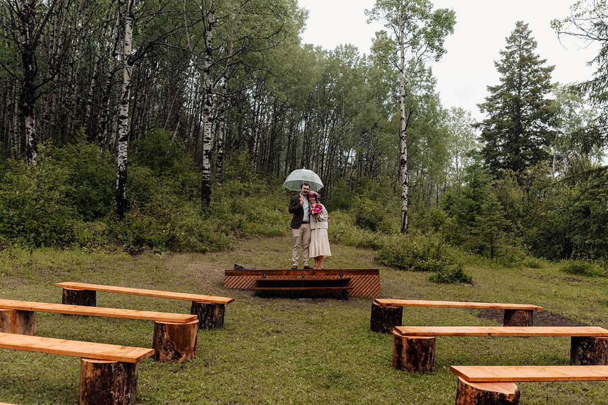 Ceremonies take place in a beautifully natural outdoor setting, where rustic plank and stump benches lead to a simple wooden stage tucked among the trees. Smaller weddings can also make use of the warm, wood-accented interior common room for cozy, candlelit gatherings.